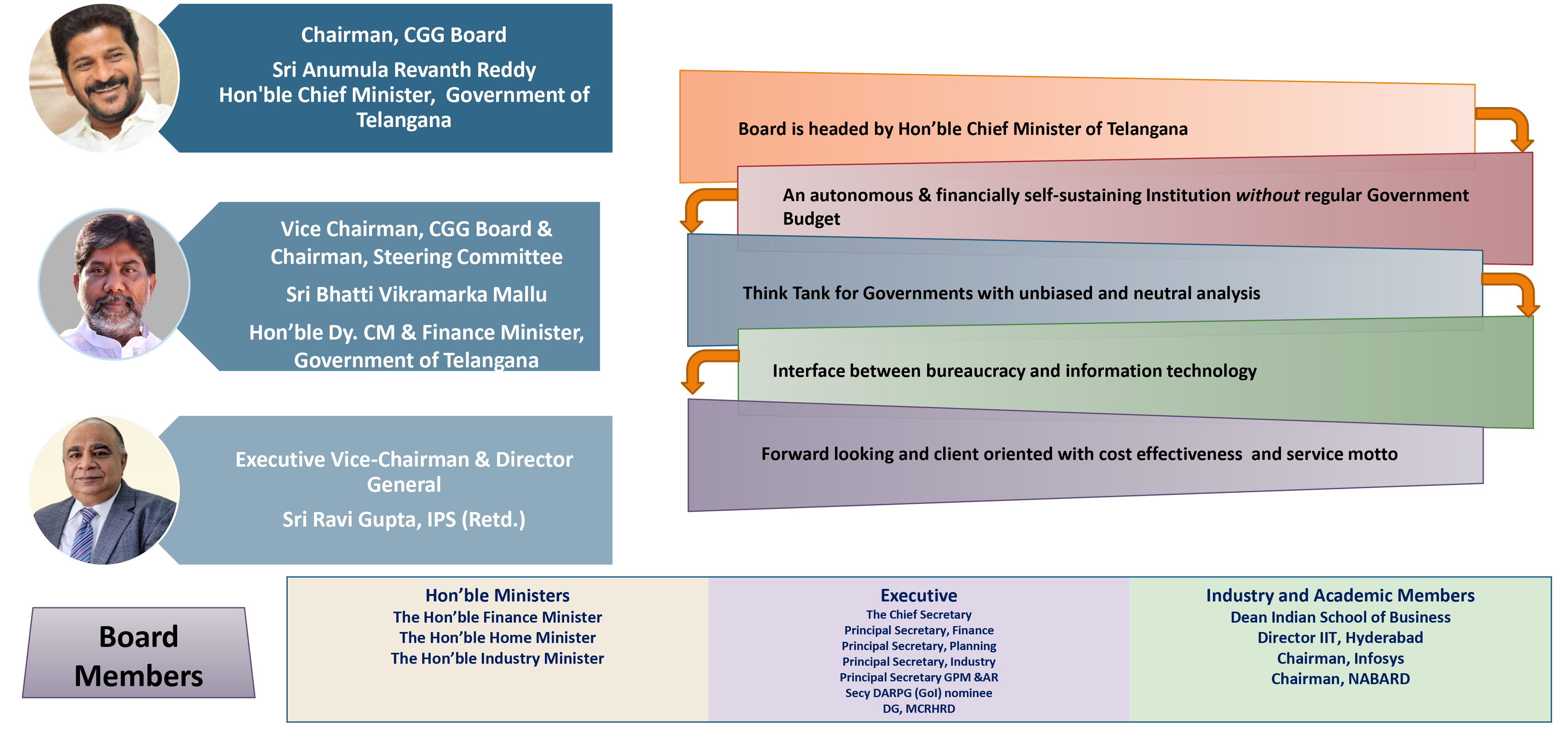 The Centre for Good Governance is governed by the Board of Governors chaired by the Hon'ble Chief Minister of Telangana and Hon’ble Deputy CM & Finance Minister as Vice Chairman of the Board. Members of the Board consist of three distinct group of members. The Ministers of IT & Finance are the members of Board providing political vision. The Chief Secretary to Government and key Government Secretaries of the Telangana provide executive strength and other members such as the Director, Indian Institute of Technology, Hyderabad; Director, Indian School of Business etc. provide industry and academic strength to the board of CGG. The Board of Governors of CGG is strategically designed to provide vision and strength to the Organization in governance reforms, offering diverse and broader perspectives to decision making.